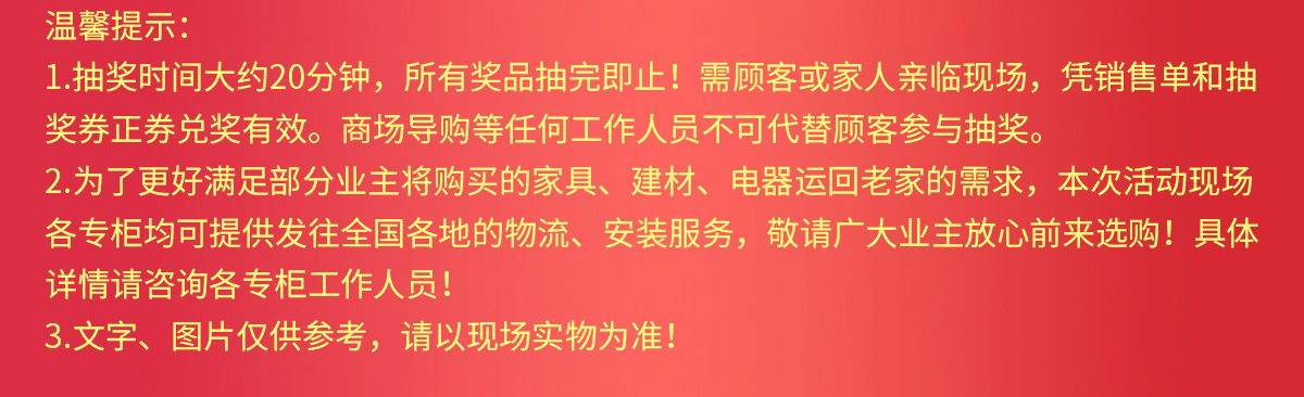 现场百万件特价产品同享活动价,请网上报名锁定优惠折扣,在12月24-25日(限此2天)亲临现场查看。半年之内送货均有效,特殊情况还可以延迟。