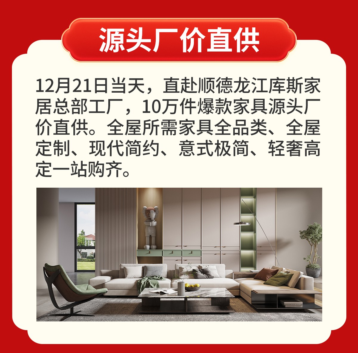 总部工厂开仓,10万件爆款家具源头厂价直供!全屋所需家具全品类、全屋定制、现代简约、意式极简、轻奢高定一站购齐!更多厂购爆款现场揭晓!活动限12月21日一天,报名方可参与。未报名者恕不接待,敬请留意!