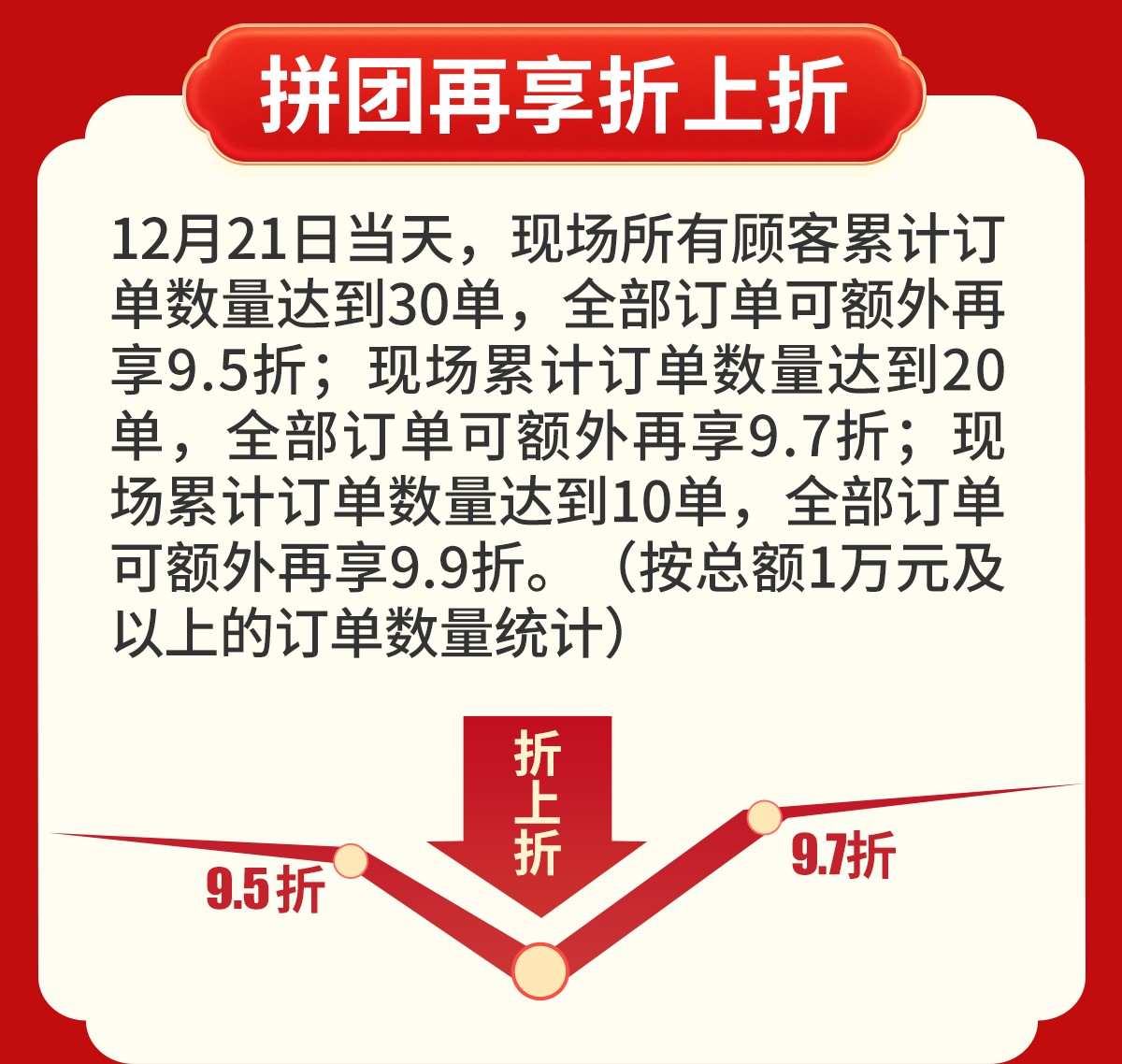 现场百万件特价产品同享活动价,请网上报名锁定优惠折扣,在12月21日(周日)亲临现场查看。半年之内送货均有效,特殊情况还可以延迟。