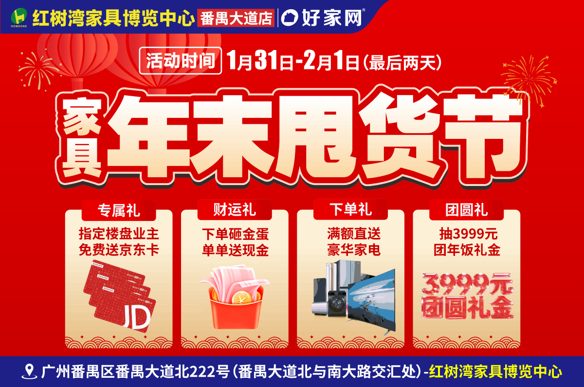 指定楼盘新业主免费送京东卡,砸金蛋单单送现金,满额送1000件豪华家电,狂抽3999元团年饭礼金大奖......优惠尽在1月31日-2月1日红树湾家具博览中心番禺大道店举办的【家具年末甩货节】大型促销活动最后两天,赶紧报名锁定优惠!