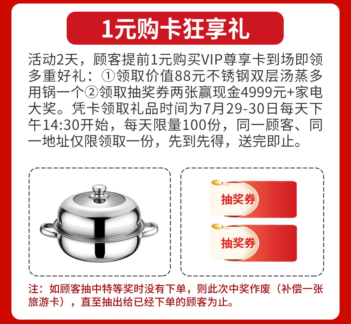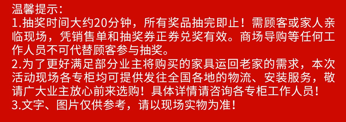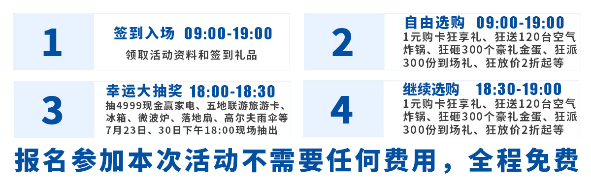现场百万件特价产品同享活动价,请网上报名锁定优惠折扣,在7月29-30日(最后2天)亲临现场查看。半年之内送货均有效,特殊情况还可以延迟。