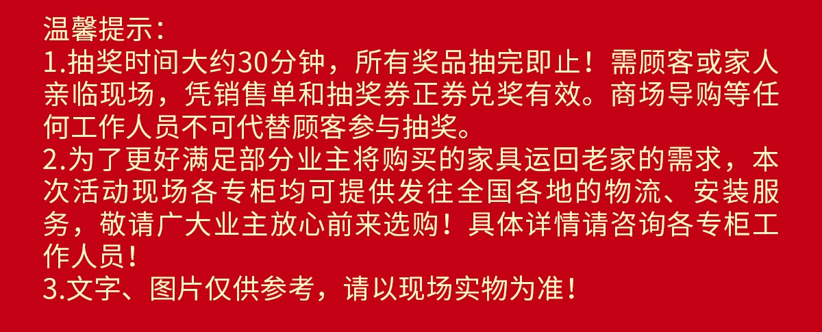 现场百万件特价产品同享活动价,请网上报名锁定优惠折扣,在12月6-7/12-14日(限此5天)亲临现场查看。半年之内送货均有效,特殊情况还可以延迟。