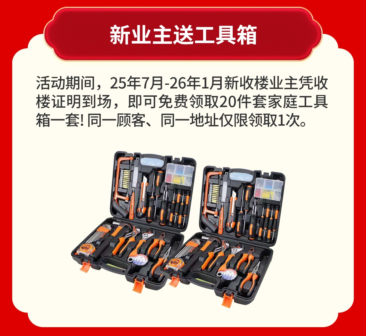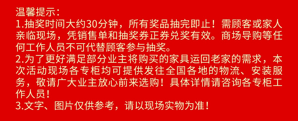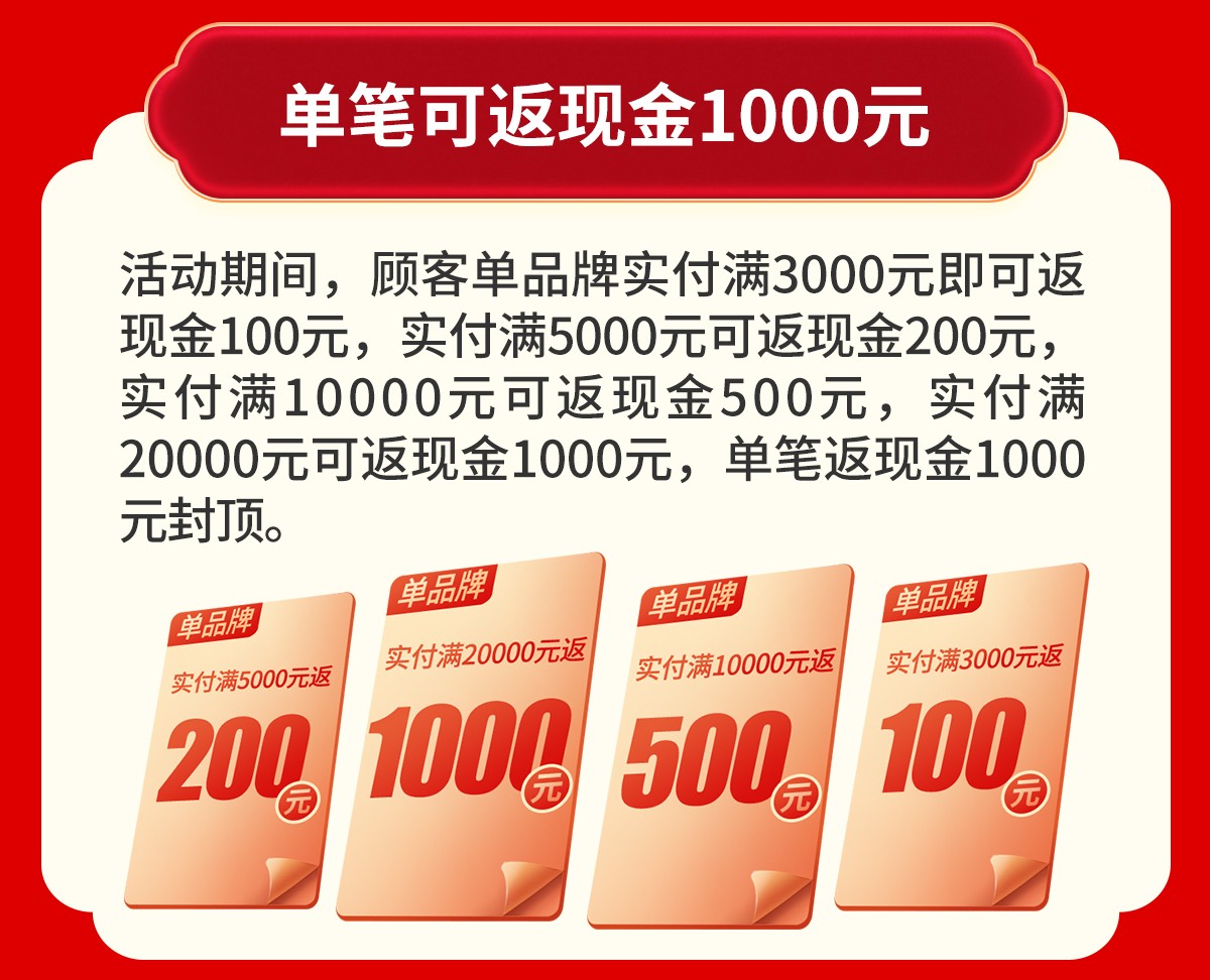 单笔可返现金1000元,满额狂送洗衣机/微波炉等千件壕礼,新业主免费送工具箱,狂抽9999元免单大奖!1月1-3/10-11日红树湾家具博览中心花都店联合好家网举办『迎新大促 家具家电开仓盛典』大型促销活动,请赶紧报名亲临现场参与吧!