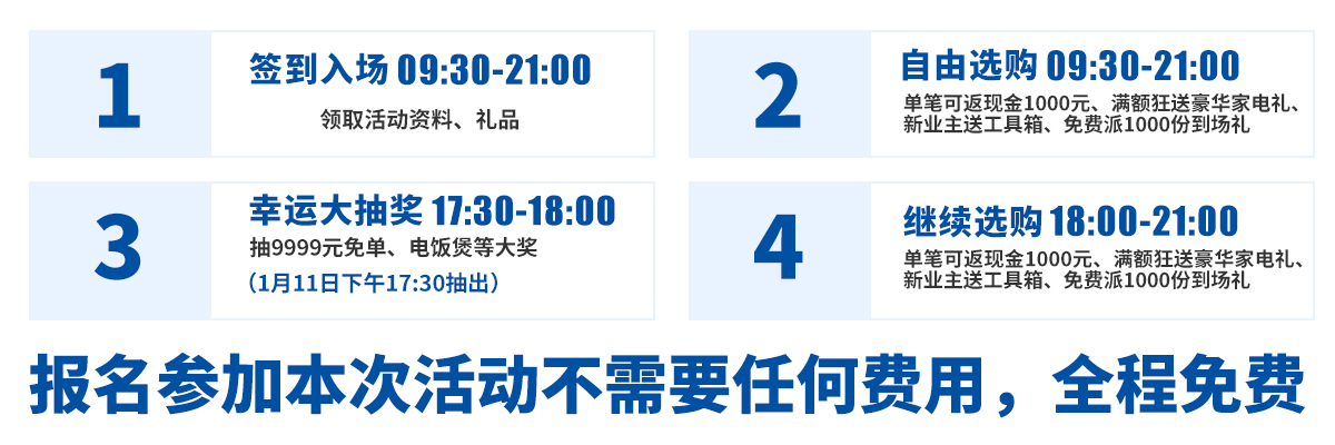 现场百万件特价产品同享活动价,请网上报名锁定优惠折扣,在1月1-3/10-11日(仅此5天)亲临现场查看。半年之内送货均有效,特殊情况还可以延迟。