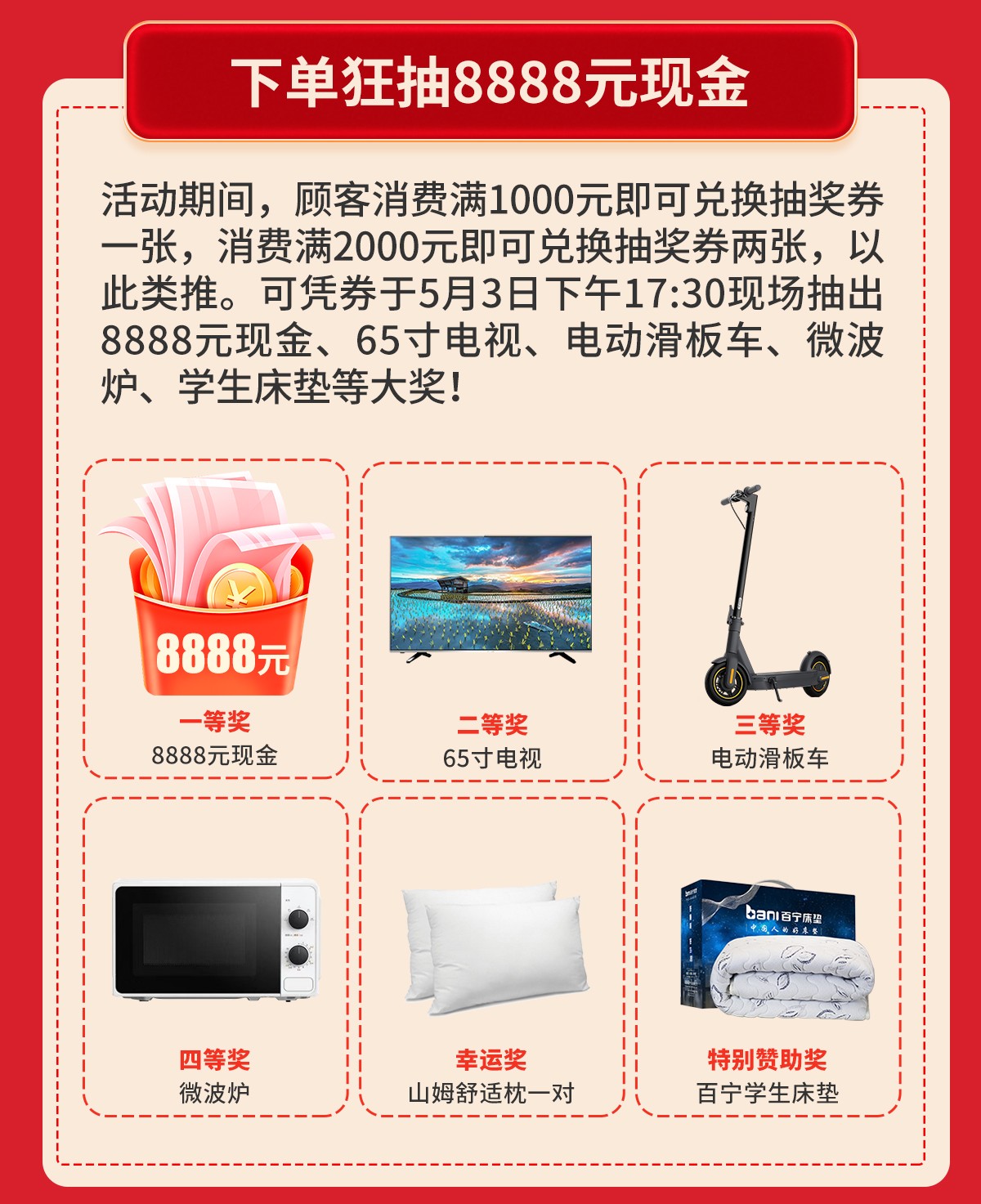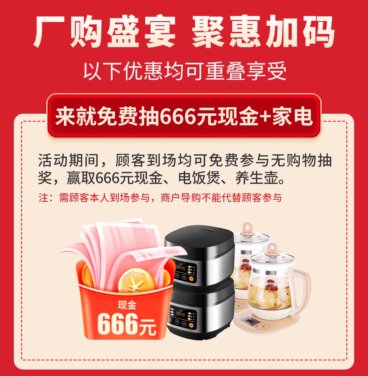 380余家具工厂厂购基地联合让利,来就免费抽666元现金+家电,集印章赢888元加油卡,掷骰子赢全屋家电+现金,下单狂抽8888元现金……优惠尽在5月1-3日『家具厂购狂欢惠』大型促销活动,赶紧报名亲临现场参加吧!