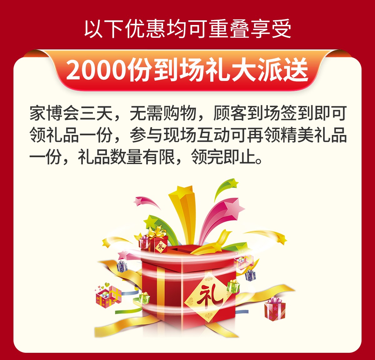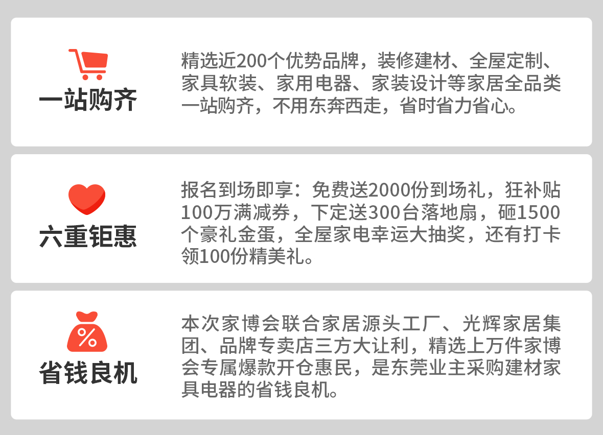 东莞超大规模、一站式家居全品类展销盛会,免费派2000份到场礼,免费领各品牌满减券,快定送300台落地扇,狂砸1500个豪礼金蛋,狂抽全屋家电大奖,还有冠名品牌专属打卡礼......优惠尽在5月1-3日举办的【2026东莞家博会】大型促销活动,仅此3天,免费报名获取入场门票。
