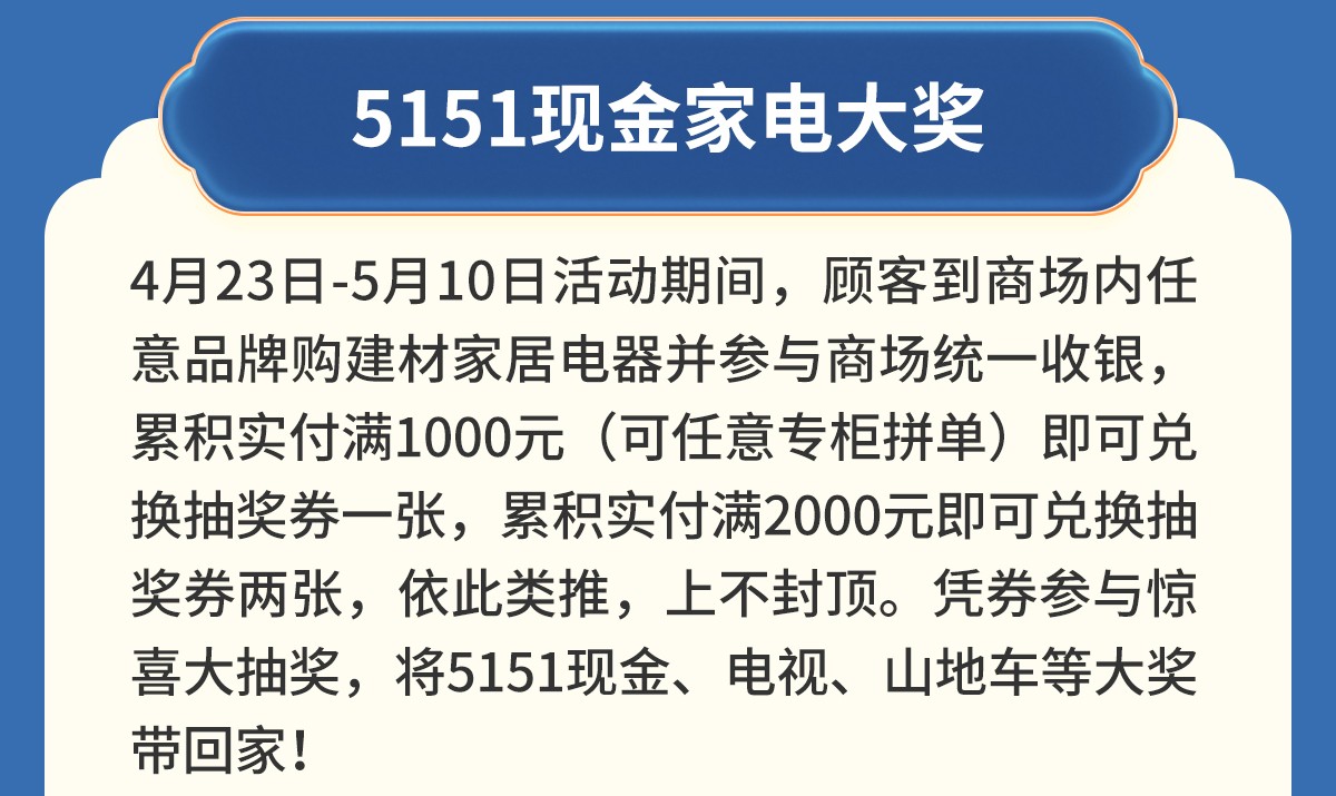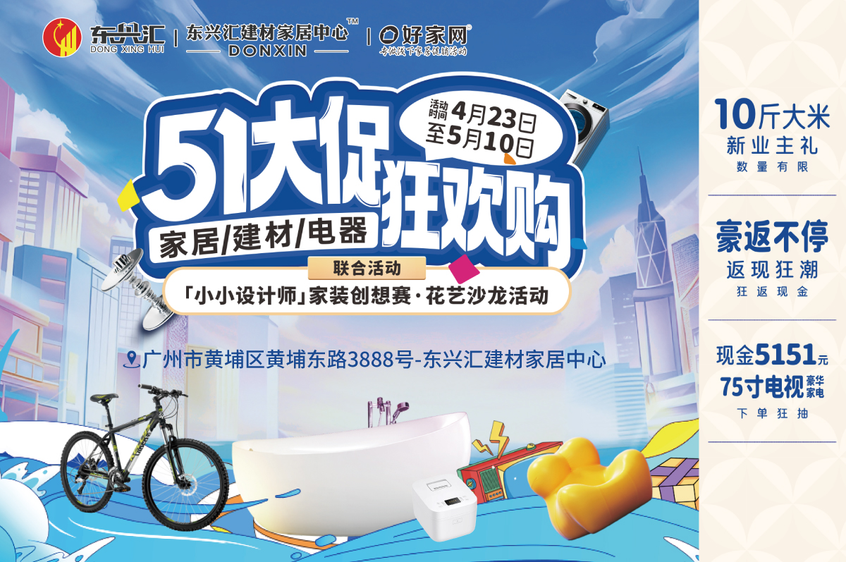 新业主免费领大礼包,下单豪返现金,抽5151元现金+家电大奖......优惠尽在4月23日-5月10日东兴汇建材家居中心携手好家网举办的【五一大促 家居建材电器狂欢购】大型促销活动,赶紧报名锁定优惠!