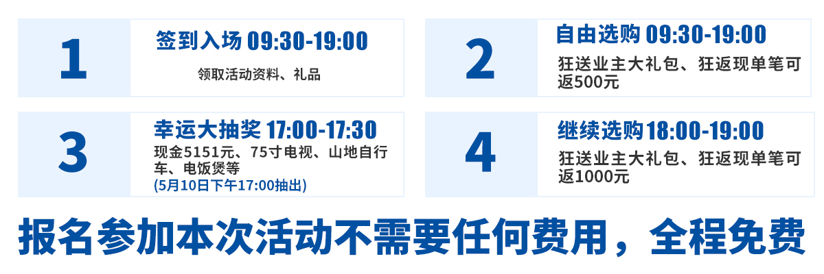 现场百万件特价产品同享活动价,请网上报名锁定优惠折扣,在4月23日-5月10日亲临现场查看。半年之内送货均有效,特殊情况还可以延迟。